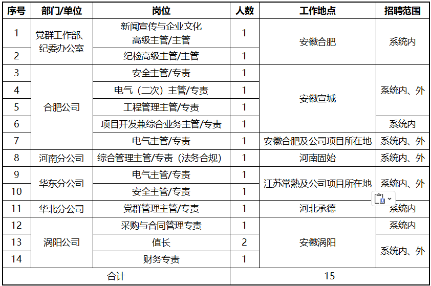 根據(jù)工作需要,現(xiàn)招聘安徽公司本部及所屬單位相關(guān)崗位。具體事項(xiàng)公告如下: