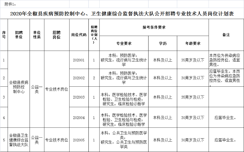 附件1:2020年全椒縣疾病預(yù)防控制中心、衛(wèi)生健康綜合監(jiān)督執(zhí)法大隊公開招聘專業(yè)技術(shù)人員崗位計劃表;