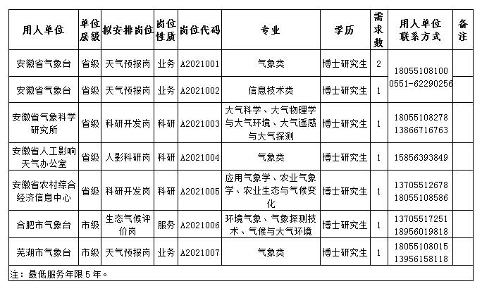 此次招聘崗位為博士崗位。具體單位、崗位、專業(yè)、學(xué)歷要求等詳見(jiàn)《安徽省氣象局2021年度事業(yè)單位博士研究生崗位需求表》。