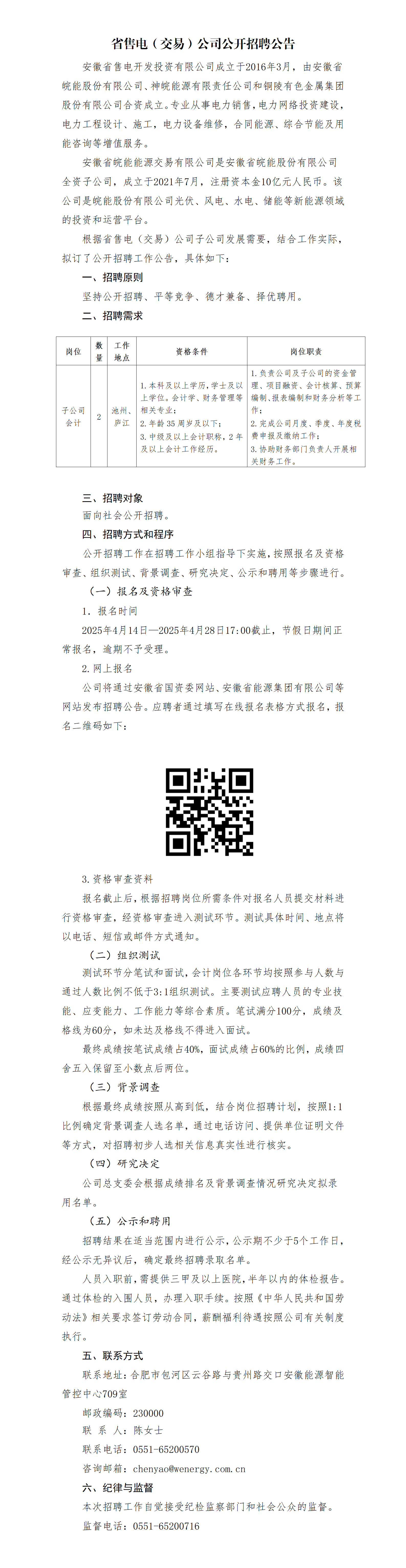 根據(jù)省售電(交易)公司子公司發(fā)展需要,結(jié)合工作實(shí)際,擬訂了公開招聘工作公告,具體如下: