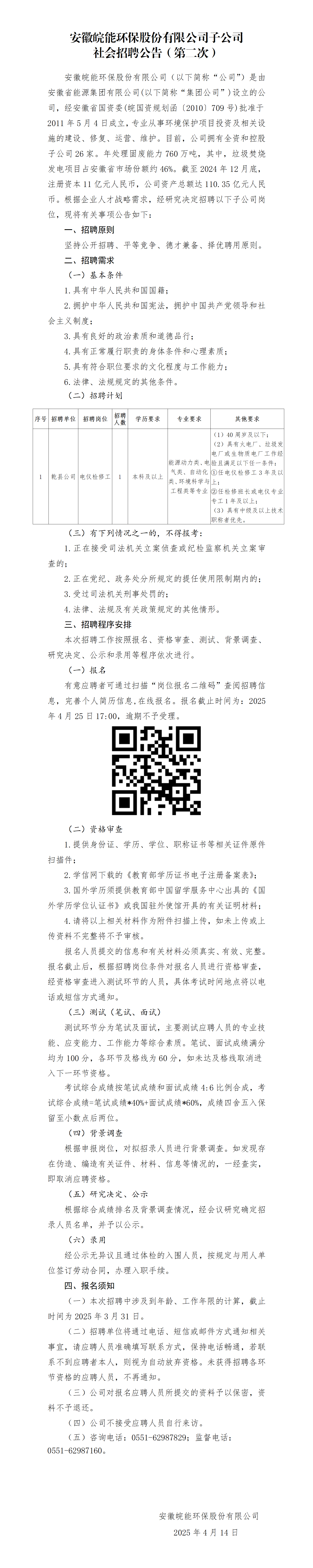 2025年安徽皖能環(huán)保股份有限公司子公司社會(huì)招聘公告(第二次)