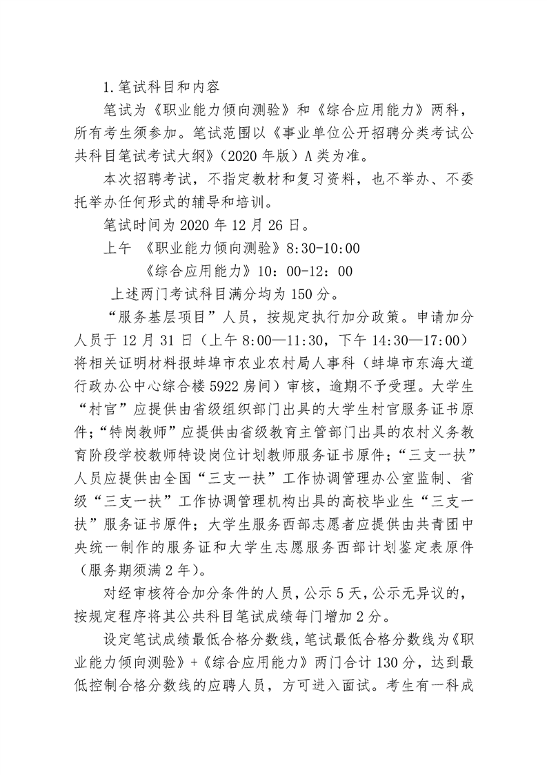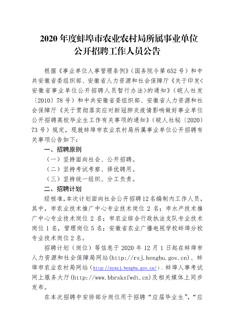 2020-12-01 23:37:34閱讀()蚌埠市人力資源和社會保障局根據(jù)《事業(yè)單位人事管理條例》(國務(wù)院令第652號)和中共安徽省委組織部、安徽省人力資源和社會保障廳《關(guān)于印發(fā)<安徽省事業(yè)單位公開招聘人員暫行辦法>的通知》(皖人社發(fā)〔2010〕78號)和中共安徽省委組織部、安徽省人力資源和社會保障廳《關(guān)于貫徹落實應(yīng)對新冠肺炎疫情影響做好事業(yè)單位公開招聘高校畢業(yè)生工作有關(guān)事項的通知》(皖人社秘〔2020〕73號)規(guī)定,現(xiàn)就蚌埠市農(nóng)業(yè)農(nóng)村局所屬事業(yè)單位公開招聘有關(guān)事項公告如下: