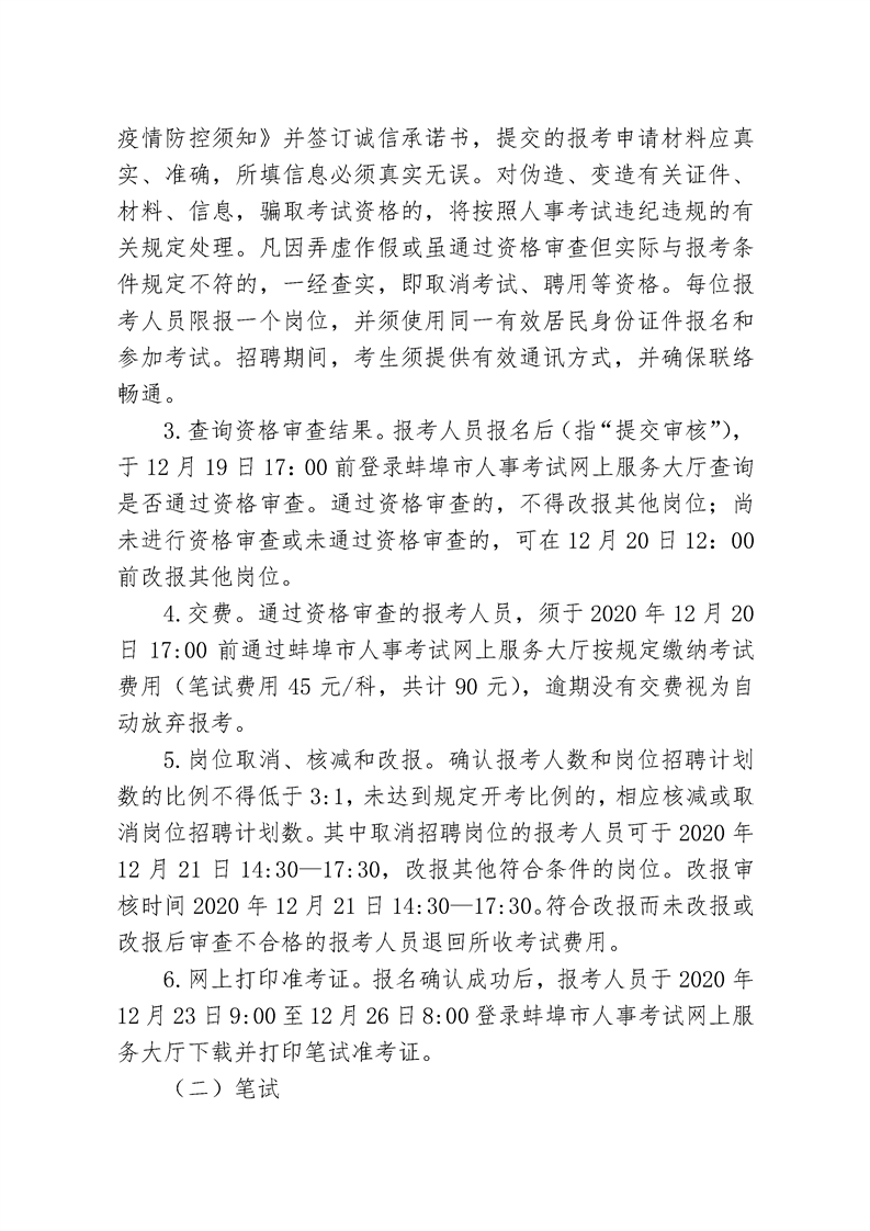3.查詢資格審查結(jié)果。報考人員報名后(指“提交審核”),于12月19日17:00前登錄蚌埠市人事考試網(wǎng)上服務(wù)大廳查詢是否通過資格審查。通過資格審查的,不得改報其他崗位;尚未進(jìn)行資格審查或未通過資格審查的,可在12月20日12:00前改報其他崗位。