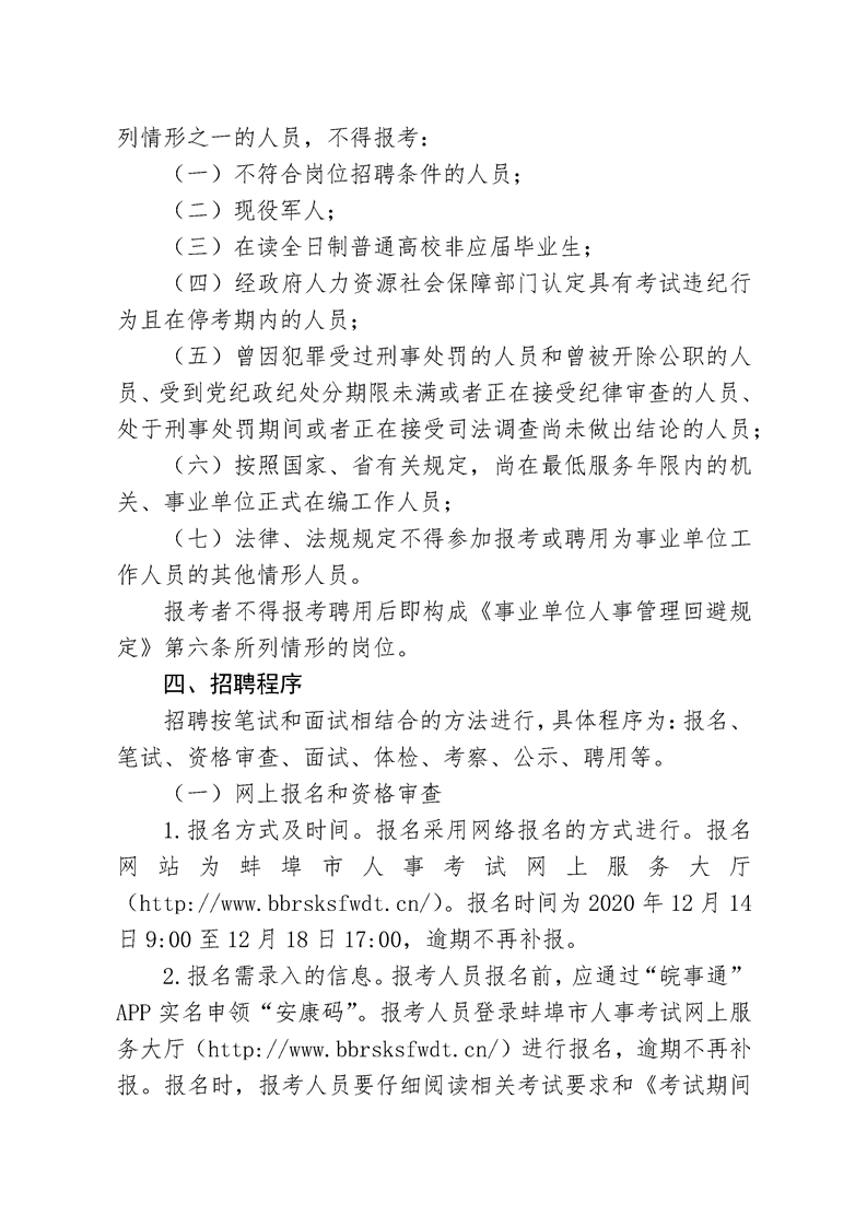 2.報名需錄入的信息。報考人員報名前,應(yīng)通過“皖事通”APP實名申領(lǐng)“安康碼”。報考人員登錄蚌埠市人事考試網(wǎng)上服務(wù)大廳(http://www.bbrsksfwdt.cn/)進(jìn)行報名,逾期不再補報。報名時,報考人員要仔細(xì)閱讀相關(guān)考試要求和《考試期間疫情防控須知》并簽訂誠信承諾書,提交的報考申請材料應(yīng)真實、準(zhǔn)確,所填信息必須真實無誤。對偽造、變造有關(guān)證件、材料、信息,騙取考試資格的,將按照人事考試違紀(jì)違規(guī)的有關(guān)規(guī)定處理。凡因弄虛作假或雖通過資格審查但實際與報考條件規(guī)定不符的,一經(jīng)查實,即取消考試、聘用等資格。每位報考人員限報一個崗位,并須使用同一有效居民身份證件報名和參加考試。招聘期間,考生須提供有效通訊方式,并確保聯(lián)絡(luò)暢通。
