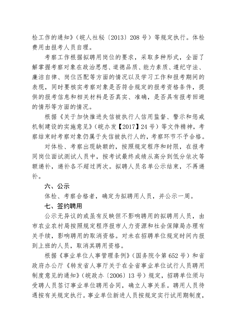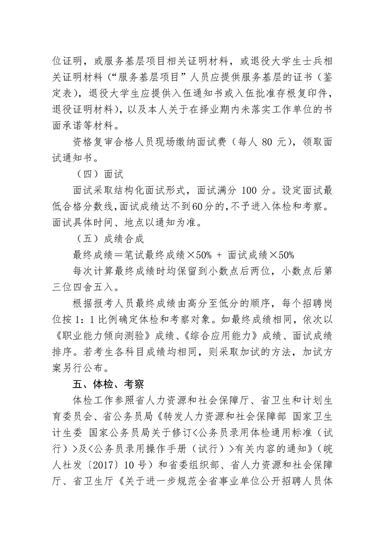 體檢工作參照省人力資源和社會保障廳、省衛(wèi)生和計劃生育委員會、省公務(wù)員局《轉(zhuǎn)發(fā)人力資源和社會保障部 國家衛(wèi)生計生委 國家公務(wù)員局關(guān)于修訂<公務(wù)員錄用體檢通用標(biāo)準(zhǔn)(試行)>及<公務(wù)員錄用操作手冊(試行)>有關(guān)內(nèi)容的通知》(皖人社發(fā)〔2017〕10號)和省委組織部、省人力資源和社會保障廳、省衛(wèi)生廳《關(guān)于進(jìn)一步規(guī)范全省事業(yè)單位公開招聘人員體檢工作的通知》(皖人社秘〔2013〕208號)等規(guī)定執(zhí)行。體檢費用由報考人員自理。
