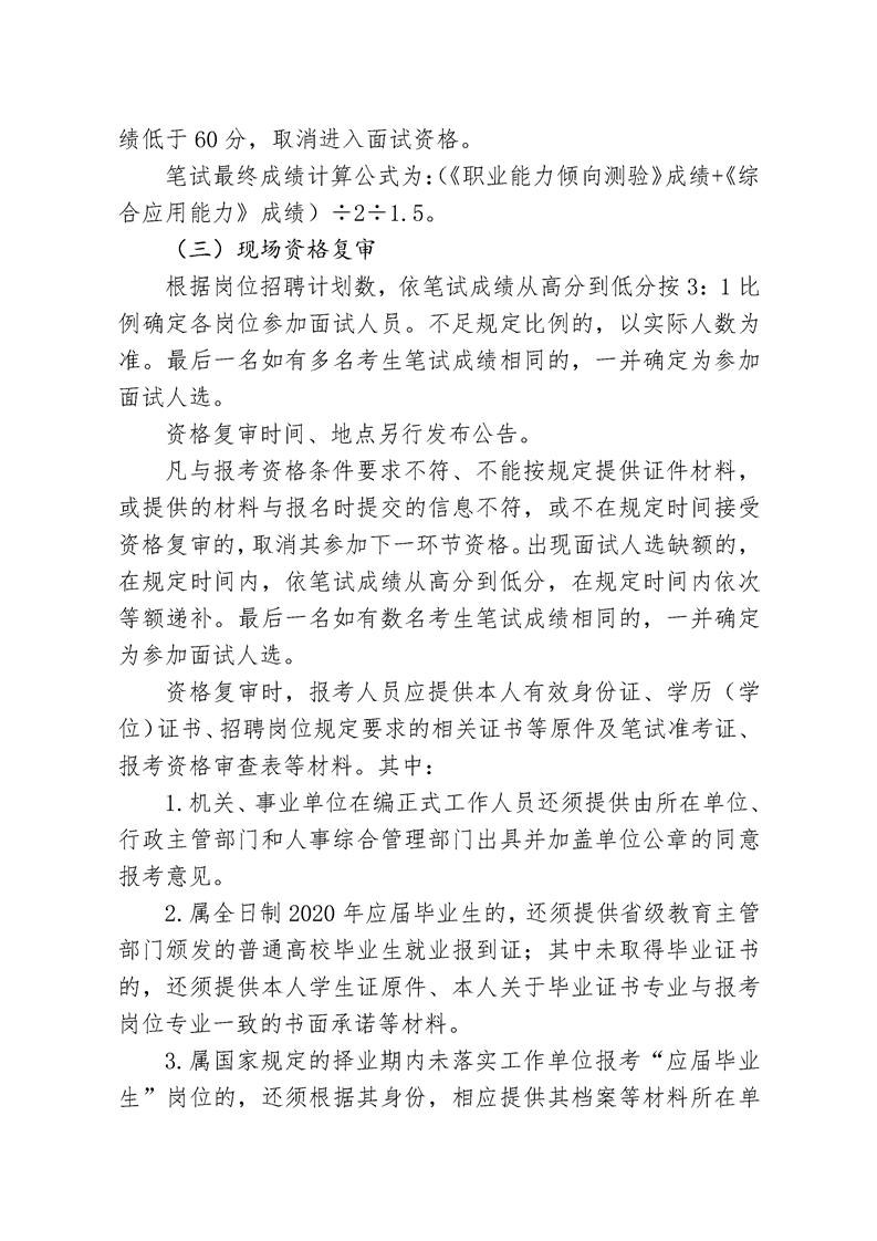 凡與報考資格條件要求不符、不能按規(guī)定提供證件材料,或提供的材料與報名時提交的信息不符,或不在規(guī)定時間接受資格復(fù)審的,取消其參加下一環(huán)節(jié)資格。出現(xiàn)面試人選缺額的,在規(guī)定時間內(nèi),依筆試成績從高分到低分,在規(guī)定時間內(nèi)依次等額遞補。最后一名如有數(shù)名考生筆試成績相同的,一并確定為參加面試人選。
