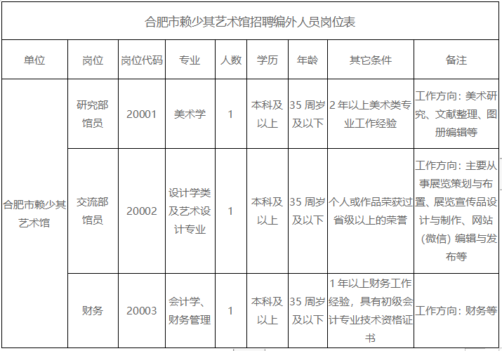 合肥市賴少其藝術館是合肥市委、市政府為建設文化強市,提高文化品位,收藏曾菲女士捐贈的賴少其300件書畫珍品和寶貴史料,展示和弘揚賴少其藝術,投資新建的公益性文化設施,于2005年12月22日落成并對外免費開放,隸屬于合肥市文化和旅游局。作為合肥市公益性文化事業(yè)單位和合肥市對外文化窗口,藝術館至今已13次入選文化和旅游部各類重點項目,其中連續(xù)7次入選“文化和旅游部全國美術館館藏精品展出季”項目,連續(xù)2次入選“文化和旅游部內(nèi)地與港澳文化交流重點項目”,4次榮獲文化部獎項。因工作需要,合肥市賴少其藝術館面向社會公開招聘3名工作人員。具體如下: