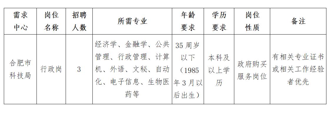 因工作需要,合肥市科學(xué)技術(shù)局現(xiàn)擬面向社會(huì)公開招聘政府購買服務(wù)崗位工作人員3名?,F(xiàn)就有關(guān)事項(xiàng)公告如下: