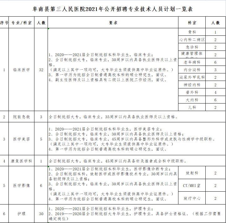 為滿足醫(yī)院業(yè)務(wù)發(fā)展需求,根據(jù)有關(guān)規(guī)定及醫(yī)院工作實際,現(xiàn)就阜南縣第三人民醫(yī)院2021年公開招聘專業(yè)技術(shù)人員有關(guān)事項公告如下:
