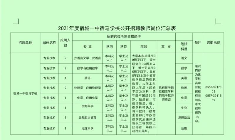 2021-05-06 22:24:18閱讀()宿州市教育體育局根據(jù)省委組織部、省人力資源和社會保障廳《關(guān)于印發(fā)<安徽省事業(yè)單位公開招聘人員暫行辦法>的通知》(皖人社發(fā)〔2010〕78號)規(guī)定,經(jīng)市政府同意,宿城一中宿馬學(xué)校根據(jù)工作需要面向社會公開招聘教師,現(xiàn)將有關(guān)事項公告如下: