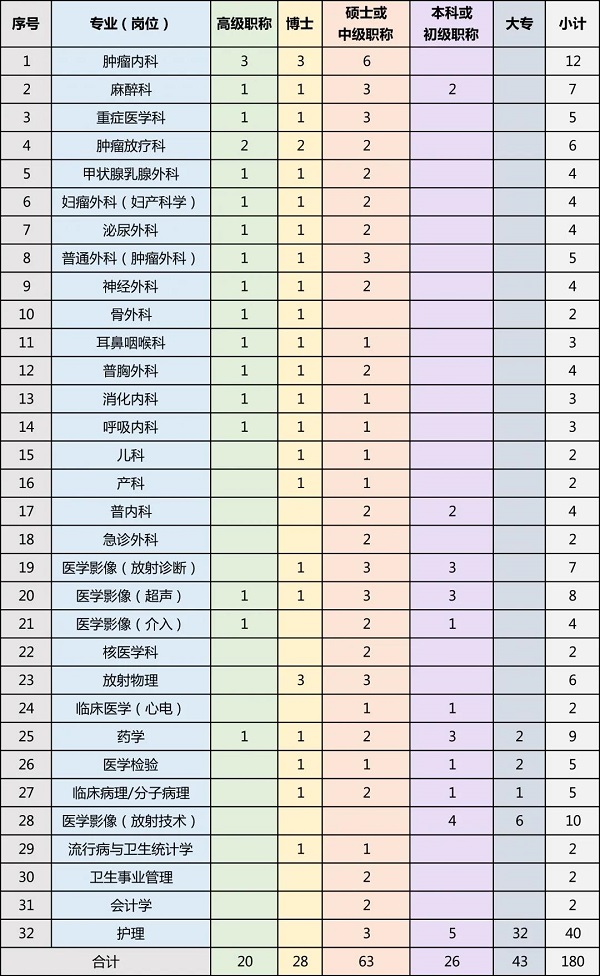 在中科院和安徽省暨合肥市的大力支持下,一所1500張床位的高水平、現(xiàn)代化三級(jí)甲等腫瘤??漆t(yī)院(高新院區(qū))正在建設(shè)中,根據(jù)醫(yī)院發(fā)展規(guī)劃,現(xiàn)面向全社會(huì)公開(kāi)招聘各類專業(yè)技術(shù)人才,2020年人才招聘計(jì)劃如下: