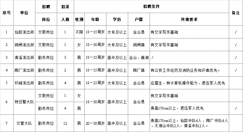 詳見附件1《含山縣公安局招聘警務(wù)輔助人員職位表》