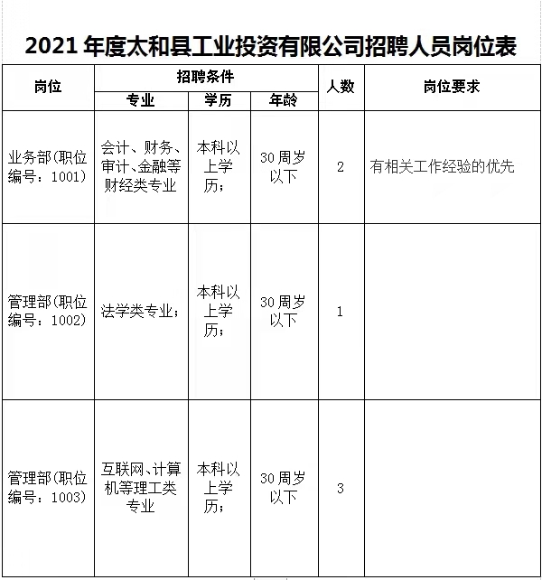 太和縣工業(yè)投資有限公司是經(jīng)太和縣人民政府批準(zhǔn),由太和縣國(guó)有資產(chǎn)管理局單獨(dú)出資設(shè)立的一家國(guó)有獨(dú)資公司。公司主營(yíng)工業(yè)項(xiàng)目投資、助保金貸款、資產(chǎn)運(yùn)營(yíng)、工業(yè)項(xiàng)目信息咨詢服務(wù)、基礎(chǔ)設(shè)施建設(shè)、棚戶區(qū)改造、農(nóng)村路網(wǎng)建設(shè)、農(nóng)業(yè)技術(shù)開(kāi)發(fā)、污水處理等。現(xiàn)根據(jù)公司業(yè)務(wù)發(fā)展需要,擬面向社會(huì)公開(kāi)招聘6名工作人員,具體公告如下:
