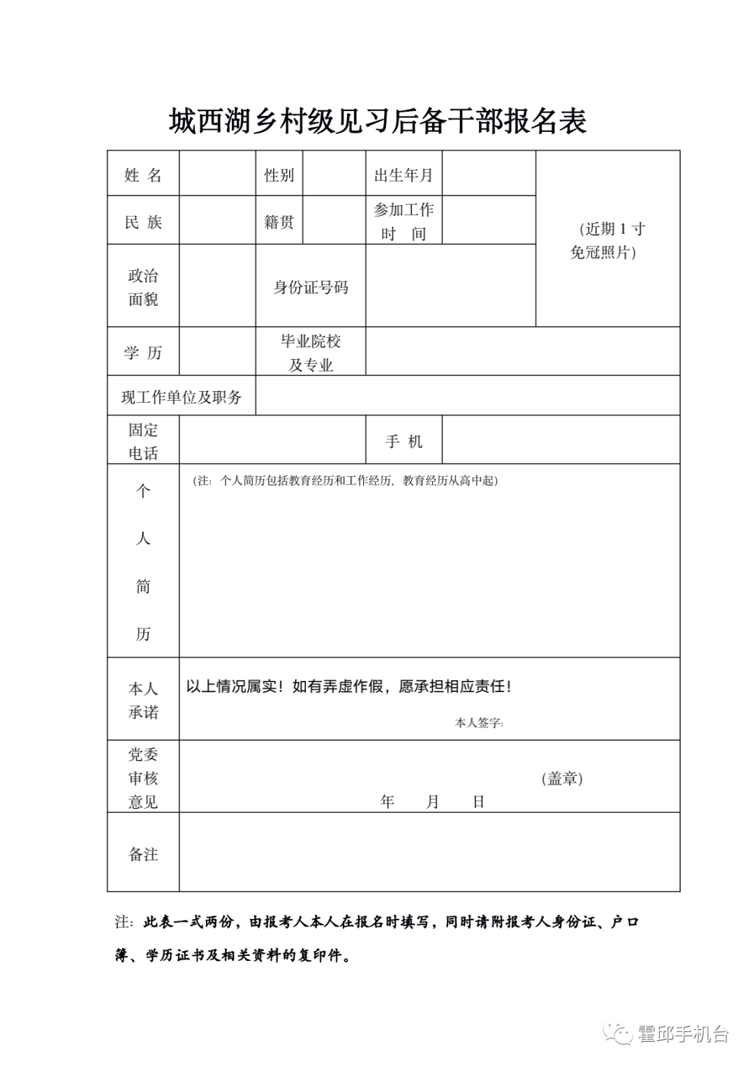 報(bào)名方式:符合條件的報(bào)名人員需攜帶有效居民身份證、戶口薄、學(xué)歷畢業(yè)證書、黨員證明材料、退役軍人證明原件以及復(fù)印件各1份、1寸證件照4張到鄉(xiāng)黨建辦報(bào)名,填寫《城西湖鄉(xiāng)公開(kāi)選聘見(jiàn)習(xí)村干部報(bào)名表》報(bào)名。
