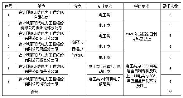 宿州明麗陽光電力維修工程有限責任公司(以下簡稱公司)是國網(wǎng)宿州供電公司產(chǎn)業(yè)單位,主要受托開展宿州地區(qū)所屬鄉(xiāng)鎮(zhèn)10千伏及以下配網(wǎng)設備現(xiàn)場巡檢維護、故障搶修,0.4千伏及以下客戶服務業(yè)務。根據(jù)公司發(fā)展需求,現(xiàn)面向社會公開招聘。