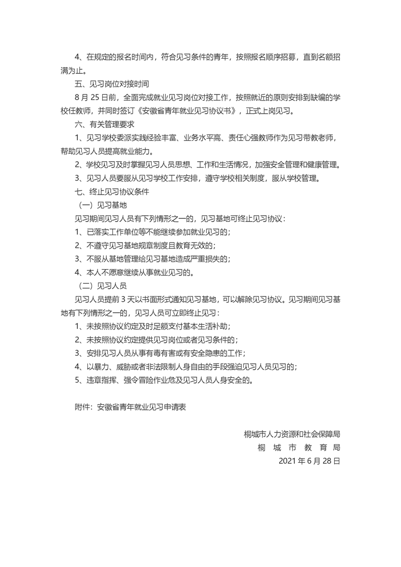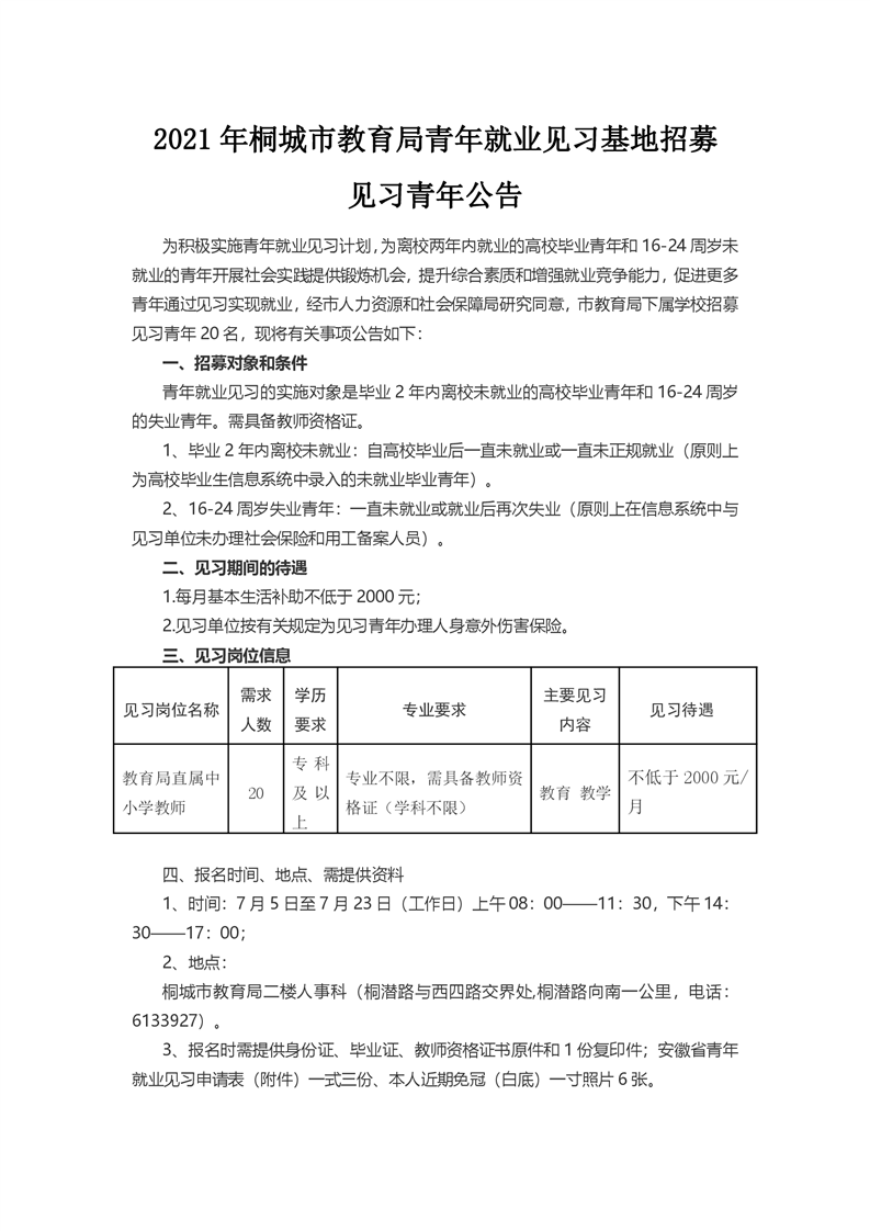 2021年安慶桐城市教育局青年就業(yè)見習(xí)基地招募見習(xí)青年公告