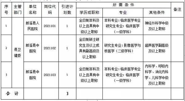 2021-07-30 20:57:09閱讀()郎溪縣人民政府為深入實(shí)施人才興縣戰(zhàn)略,加快打造郎溪人才集聚高地,根據(jù)《郎溪縣高層次、急需緊缺醫(yī)療技術(shù)人才引進(jìn)工作實(shí)施辦法(試行)》,經(jīng)研究,決定開展2021年郎溪縣縣級公立醫(yī)院引高層次、急需緊缺醫(yī)療技術(shù)人才引進(jìn)工作?,F(xiàn)就有關(guān)事項(xiàng)公告如下:
