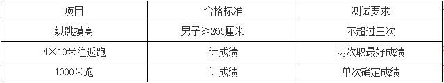 體能測試項目:縱跳摸高、4×10米往返跑、1000米跑。測試標準參照《公安機關錄用人民警察體能測評項目和標準》執(zhí)行。