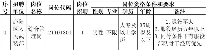 因根據(jù)工作需要,經(jīng)廬陽區(qū)人民武裝部研究決定,現(xiàn)委托遠(yuǎn)創(chuàng)人力資源管理集團(tuán)有限公司面向社會(huì)公開招考工作人員1名,現(xiàn)將有關(guān)事項(xiàng)公告如下: