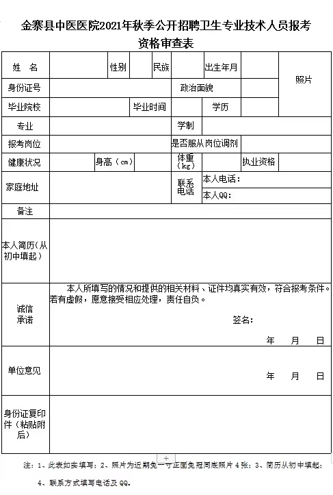 3、網(wǎng)上報(bào)名者可在金寨縣中醫(yī)醫(yī)院網(wǎng)站上下載《金寨縣中醫(yī)醫(yī)院2021年秋季公開(kāi)招聘衛(wèi)生專(zhuān)業(yè)技術(shù)人員報(bào)考資格審查表》(如實(shí)填寫(xiě)健康狀況及身高體重),將填寫(xiě)完整的報(bào)考資格審查表、近期一寸正面免冠同底照片及報(bào)名所需材料的掃描件或清晰照片以附件的形式上傳。在發(fā)送郵件“主題”中注明真實(shí)姓名+專(zhuān)業(yè)+報(bào)考崗位,每位報(bào)考者限報(bào)1個(gè)崗位,須使用統(tǒng)一有效居民身份證參加報(bào)名和考試(如未按要求提交報(bào)名材料或上傳材料不全視為報(bào)名無(wú)效,無(wú)考試資格,不再另行通知)。請(qǐng)報(bào)考人員在報(bào)名審核表上準(zhǔn)確填寫(xiě)聯(lián)系電話和地址,如有變化請(qǐng)及時(shí)告知。