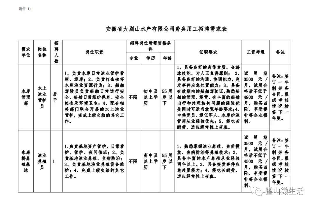 1、安徽省大別山水產(chǎn)有限公司勞務(wù)用工招聘需求表