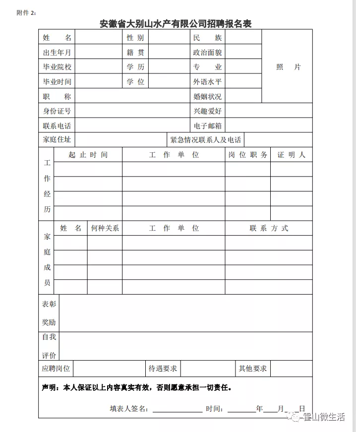 2、安徽省大別山水產(chǎn)有限公司招聘報名表