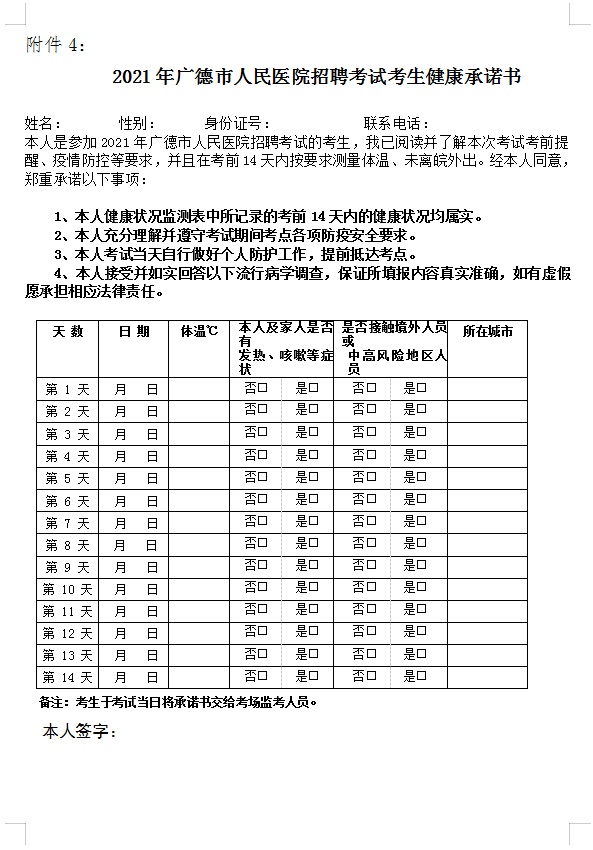 報考人員報名后,須在2021年11月10日前往廣德市人民醫(yī)院人事科領(lǐng)取準(zhǔn)考證。根據(jù)疫情防控要求,參考資格審查人員需持健康碼,測體溫。省外考生和高中風(fēng)險地區(qū)來廣人員均要持有72小時內(nèi)核酸檢測陰性證明,或提前一天到市人民醫(yī)院進(jìn)行核酸檢測。