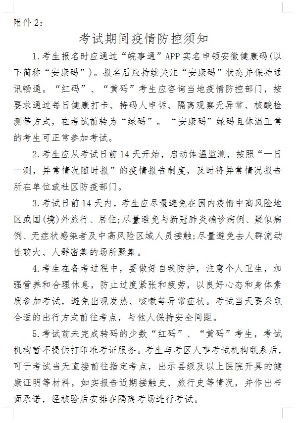 報考人員報名前,應(yīng)通過“皖事通”APP實名申領(lǐng)“安康碼”。報考人員報考前請認(rèn)真閱讀《考試期間疫情防控須知》(附件2)。報考人員提供的信息必須與本人實際情況、報考條件和所報考的崗位要求相一致。凡弄虛作假通過資格審查,其實際情況與報考條件規(guī)定不符的,一經(jīng)查實,即取消考試、聘用等資格。