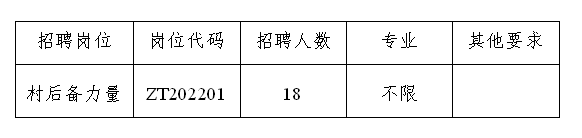 因工作需要,經(jīng)研究,現(xiàn)面向社會(huì)公開招聘周潭鎮(zhèn)18名村級(jí)后備力量,現(xiàn)將有關(guān)事項(xiàng)公告如下: