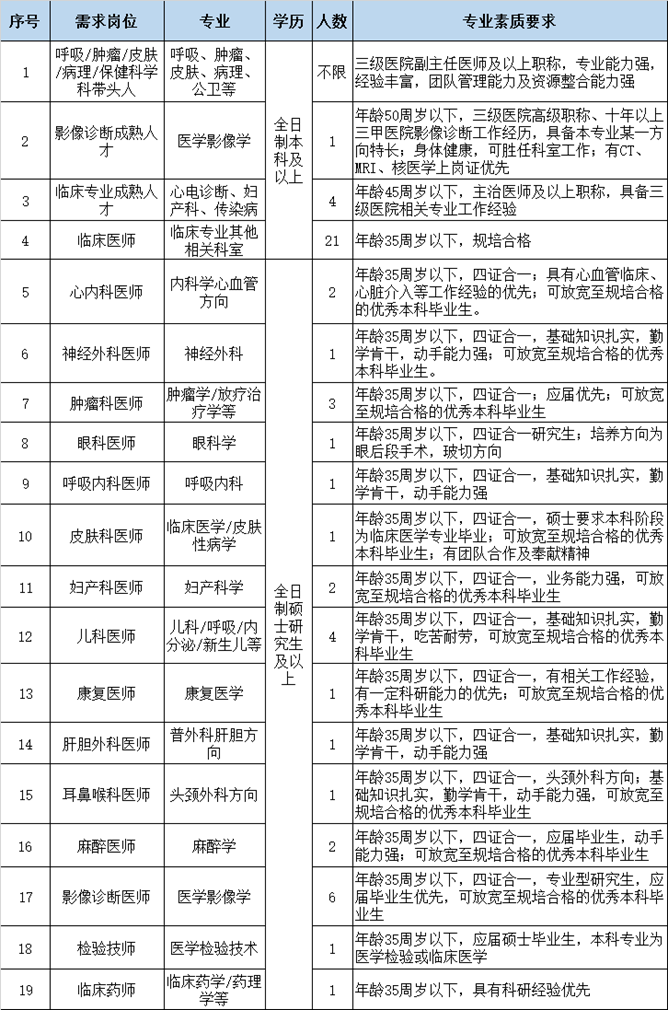 3、 “招聘崗位及要求”中未列出的專業(yè)崗位,優(yōu)秀碩士及以上研究生和已規(guī)培人員也可以電話咨詢或報(bào)名。