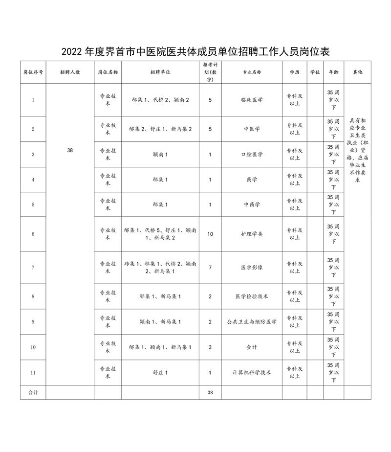 本次計(jì)劃公開(kāi)招聘工作人員38人,具體招聘崗位、人數(shù)、專(zhuān)業(yè)、報(bào)考條件等詳見(jiàn)《2022年度界首市中醫(yī)院醫(yī)共體成員單位招聘工作人員崗位表》。
