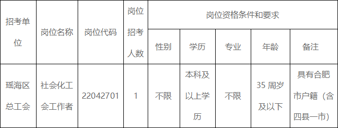 結合實際工作需要,經(jīng)研究決定,瑤海區(qū)總工會2022年面向合肥市公開招聘社會化工會工作者1名,現(xiàn)將有關事項公告如下: