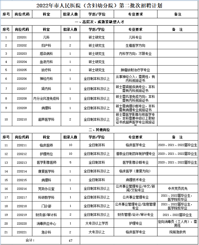 2022-05-26 20:22:23閱讀()宣城市人民醫(yī)院為滿足市人民醫(yī)院及市婦幼保健院發(fā)展需要,加強(qiáng)人才隊(duì)伍建設(shè),按照公開、平等、競(jìng)爭(zhēng)、擇優(yōu)的原則,面向社會(huì)公開招聘工作人員,現(xiàn)將有關(guān)事項(xiàng)通知如下: