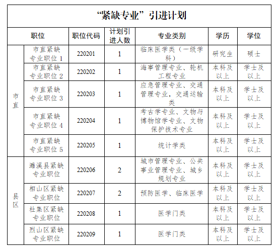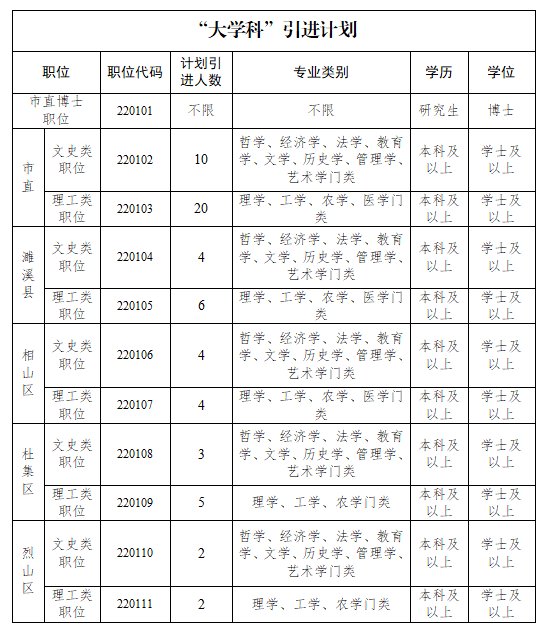 采取“大學科”+“緊缺專業(yè)”形式,市縣(區(qū))“大學科”計劃引進博士人數不限、文史類23名、理工類37名,“緊缺專業(yè)”計劃引進11名(崗位如下):