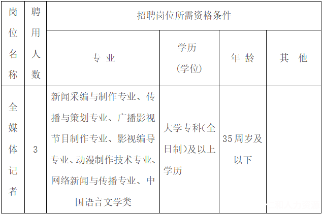 通過第三方勞務派遣方式招聘全媒體記者3名。