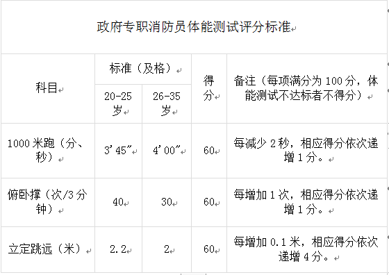 (3)測試項(xiàng)目:政府專職消防隊(duì)員1000米跑、俯臥撐、立定跳遠(yuǎn)。
