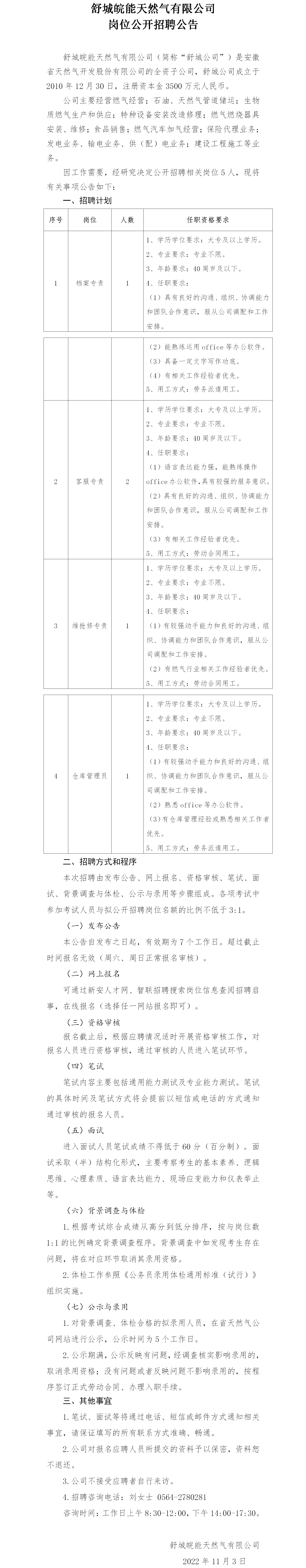 2022年六安舒城皖能天然氣有限公司崗位公開招聘公告