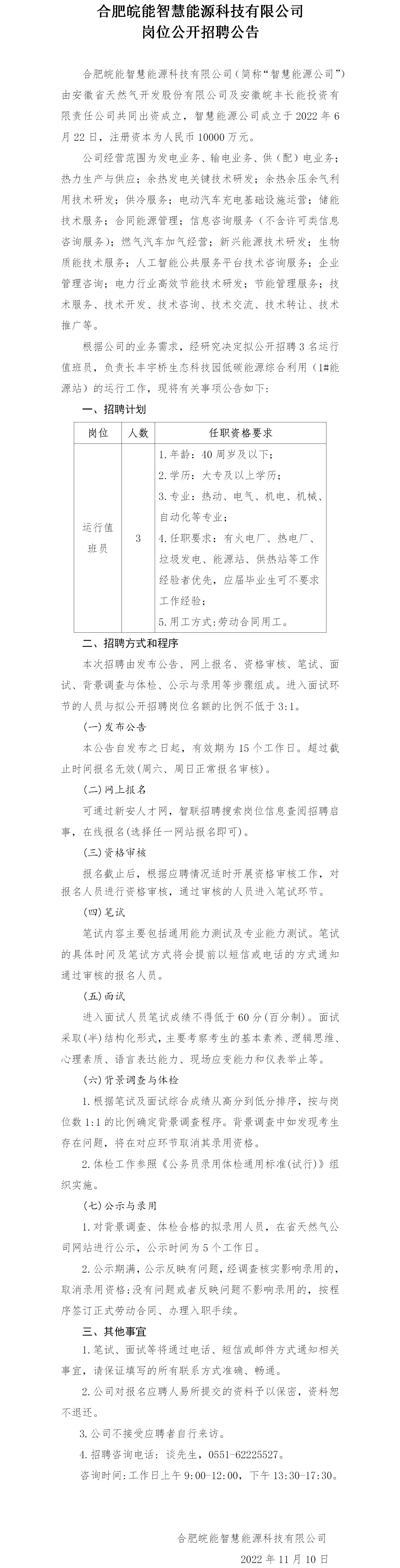 2022年合肥皖能智慧能源科技有限公司崗位公開招聘公告