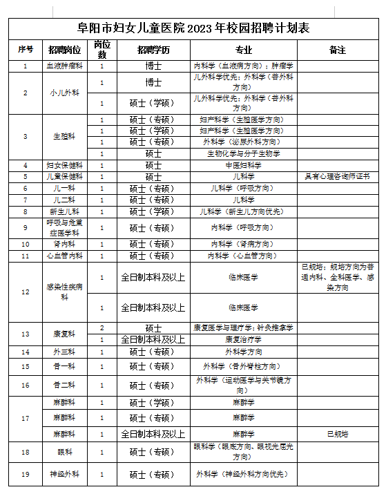 附件:阜陽市婦女兒童醫(yī)院2023年校園招聘計劃表