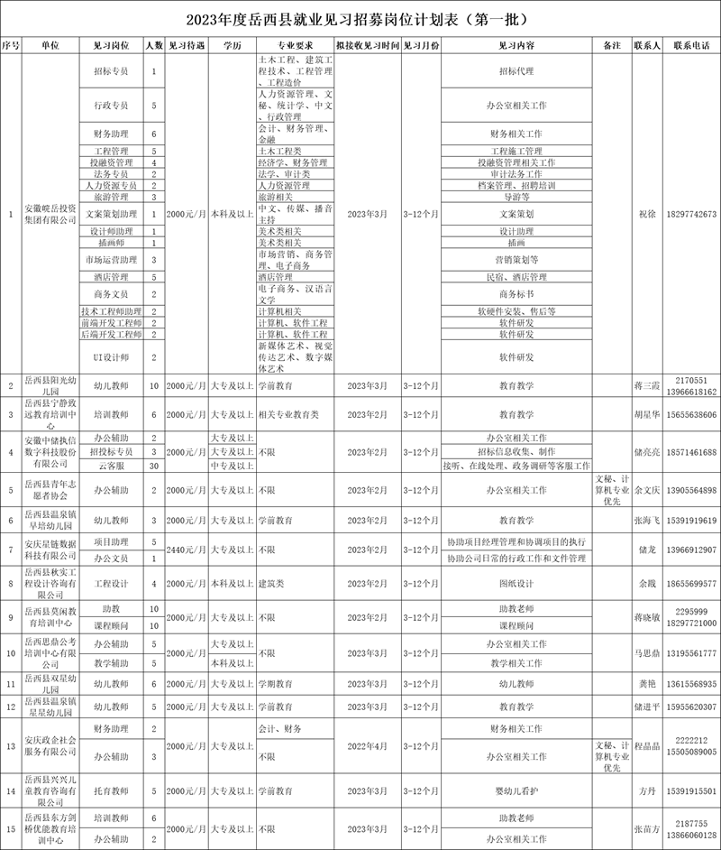 具體崗位情況、招聘條件、見習(xí)待遇及見習(xí)內(nèi)容等見附件《2023年度岳西縣就業(yè)見習(xí)招募崗位計劃表(第一批)》。