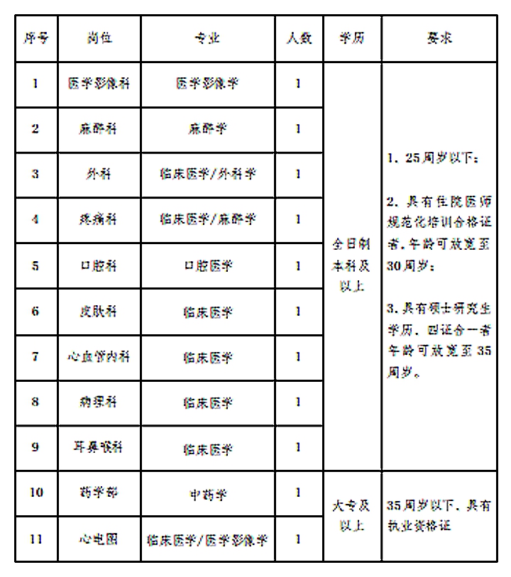 3、碩士研究生要求本科所學專業(yè)為本專業(yè)或臨床醫(yī)學類,且須具有畢業(yè)證、學位證、資格證、規(guī)培合格證(臨床醫(yī)師類)。