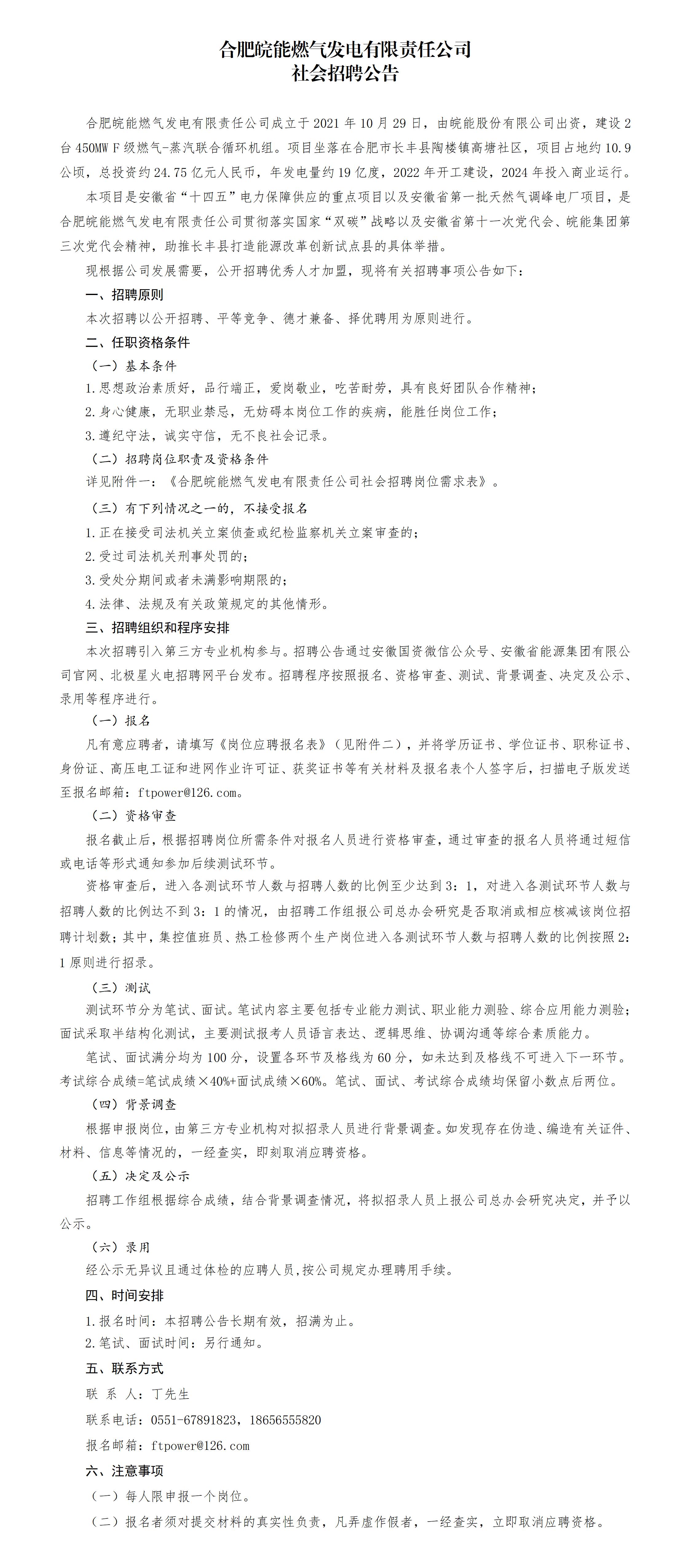 詳見附件一:《合肥皖能燃氣發(fā)電有限責任公司社會招聘崗位需求表》。