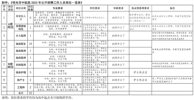 本次招聘計設(shè)32個崗位(A類崗位采用直接面試的方式,不設(shè)置開考比例。B類崗位采用筆試+面試的方式),具體崗位詳見附件《明光市中醫(yī)院2023年公開招聘工作人員崗位一覽表》(以下簡稱《崗位一覽表》)。