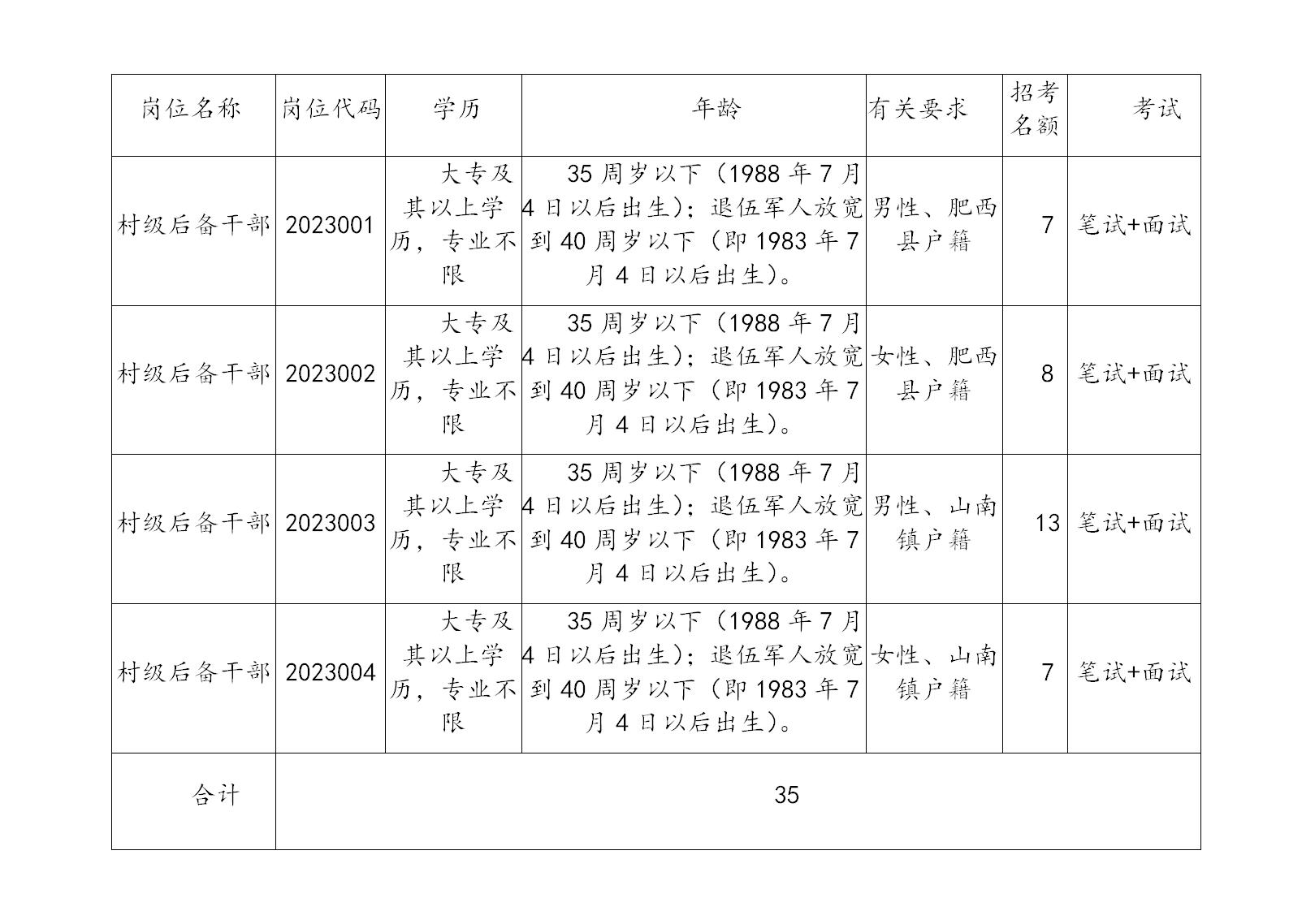 因工作需要,經(jīng)鎮(zhèn)黨委研究決定, 公開(kāi)招考村級(jí)后備干部35名:其中面向肥西縣戶籍招考15名(男性7名、女性8名);面向山南鎮(zhèn)戶籍招考20名(男性13名、女性7名),詳情見(jiàn)“肥西縣山南鎮(zhèn)2023年招考村級(jí)后備干部崗位表”。