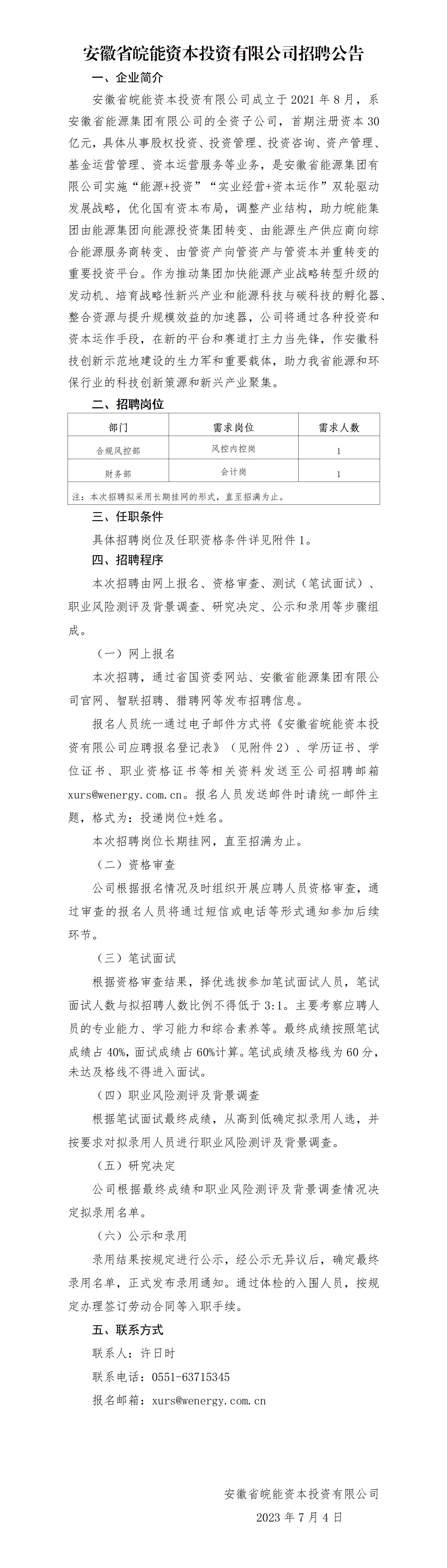 安徽省皖能資本投資有限公司成立于2021年8月,系安徽省能源集團(tuán)有限公司的全資子公司,首期注冊(cè)資本30億元,具體從事股權(quán)投資、投資管理、投資咨詢、資產(chǎn)管理、基金運(yùn)營(yíng)管理、資本運(yùn)營(yíng)服務(wù)等業(yè)務(wù),是安徽省能源集團(tuán)有限公司實(shí)施“能源+投資”“實(shí)業(yè)經(jīng)營(yíng)+資本運(yùn)作”雙輪驅(qū)動(dòng)發(fā)展戰(zhàn)略,優(yōu)化國(guó)有資本布局,調(diào)整產(chǎn)業(yè)結(jié)構(gòu),助力皖能集團(tuán)由能源集團(tuán)向能源投資集團(tuán)轉(zhuǎn)變、由能源生產(chǎn)供應(yīng)商向綜合能源服務(wù)商轉(zhuǎn)變、由管資產(chǎn)向管資產(chǎn)與管資本并重轉(zhuǎn)變的重要投資平臺(tái)。作為推動(dòng)集團(tuán)加快能源產(chǎn)業(yè)戰(zhàn)略轉(zhuǎn)型升級(jí)的發(fā)動(dòng)機(jī)、培育戰(zhàn)略性新興產(chǎn)業(yè)和能源科技與碳科技的孵化器、整合資源與提升規(guī)模效益的加速器,公司將通過(guò)各種投資和資本運(yùn)作手段,在新的平臺(tái)和賽道打主力當(dāng)先鋒,作安徽科技創(chuàng)新示范地建設(shè)的生力軍和重要載體,助力我省能源和環(huán)保行業(yè)的科技創(chuàng)新策源和新興產(chǎn)業(yè)聚集。