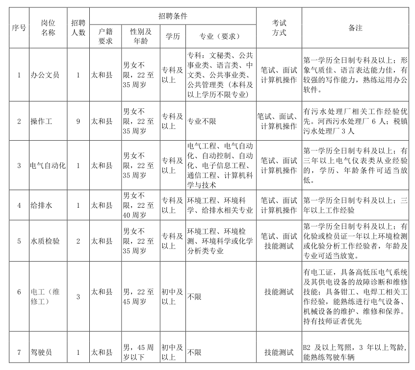 備注:太和縣河西污水處理廠位于河西新區(qū)太臨河和樂昌路交口西北側(cè),本次招聘15人;稅鎮(zhèn)污水處理廠位于稅鎮(zhèn)鎮(zhèn)工業(yè)聚集區(qū)經(jīng)二路與緯一路交叉口西南側(cè),本次招聘3人。