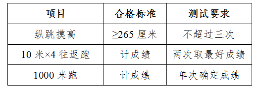 體能測(cè)試項(xiàng)目:縱跳摸高、4×10米往返跑、1000米跑。測(cè)試標(biāo)準(zhǔn)參照《公安機(jī)關(guān)錄用人民警察體能測(cè)評(píng)項(xiàng)目和標(biāo)準(zhǔn)》執(zhí)行。