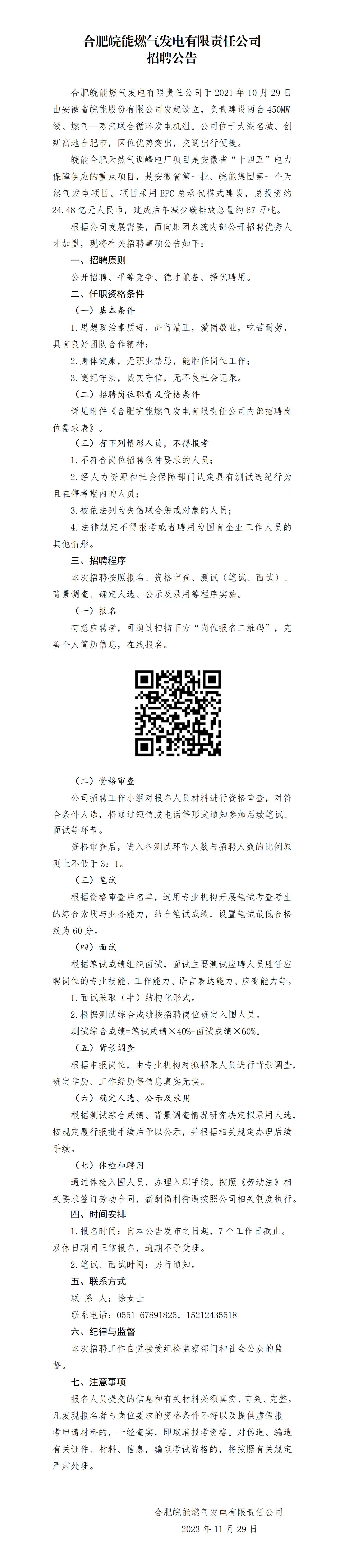 2023年合肥皖能燃氣發(fā)電有限責任公司招聘公告