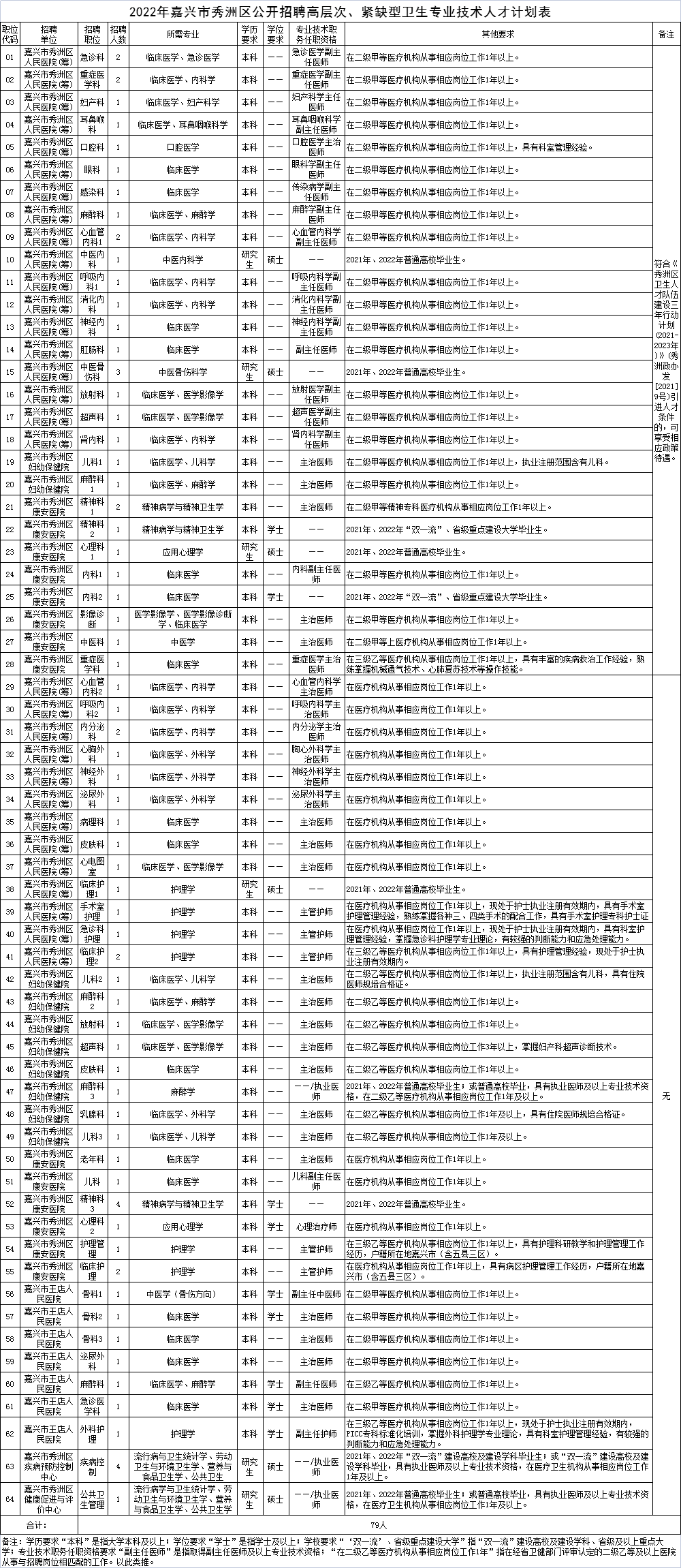 2022年嘉興市秀洲區(qū)公開招聘高層次、緊缺型衛(wèi)生專業(yè)技術(shù)人才79名。具體的招聘單位、職位、人數(shù)和資格條件詳見《2022年嘉興市秀洲區(qū)公開招聘高層次、緊缺型衛(wèi)生專業(yè)技術(shù)人才計(jì)劃表》(附件1,下稱《計(jì)劃表》)。